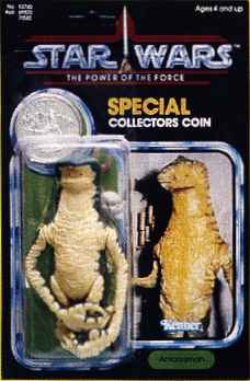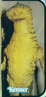 The skin on the neck and upper body seems puffier or fatter than on Jabba's amanaman, who had a loose and wrinkled hide. The puffiness of this specimen's skin makes the neck gills (if they exist other than just on the Kenner figure) practically invisible, flush with the rest of the body. Perhaps the difference is a sign of health or age. Both these amani were both on Tatooine, which is a rather dry planet. Amanin skin is sensitive and moist; it must require careful preservation in such a dry environment. It is possible that the individual at Jabba's palace was suffering from partial dehydration, causing the wrinkling. As a participant in Jabba's revelry, it could be expected that the Return of the Jedi Amanaman was taking less care of its health.
