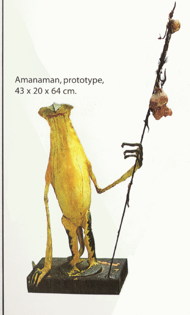 Detailed colour portrait of the Amanaman from Jabba's palace. Note the five short toes on the moon-shaped bent feet. Three human skulls hang from this headhunter's trophy staff, as testiment to his prowess in hunting sapient beings. [The second image is a smaller version of the first.]