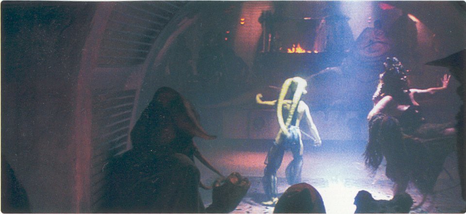 By the time the party was in full swing he had wanderd to a position almost directly opposite Jabba. During the dance he appeared to smoke a cigar and growled his ferocious speech as he regarded the dancers.