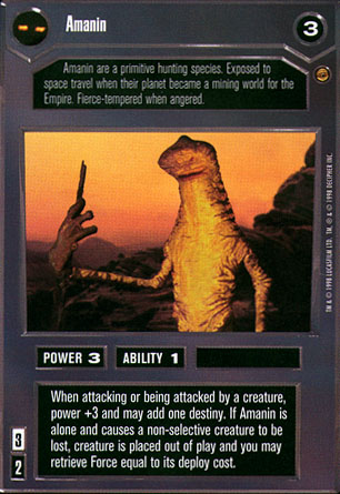 Amanin SWCCG game card. The individual depicted actually has the same stripe pattern as the one seen in Jabba's throne room in Return of the Jedi, but his accessory is different. This staff or spear has no ornaments.