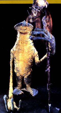 A detailed view of the prototype model for the Return of the Jedi Amanaman. Note the smoothness of the skin compared to the creature appearing in the film, and the presence of darkly-coloured excreta or slime dribbling from the mouth.
