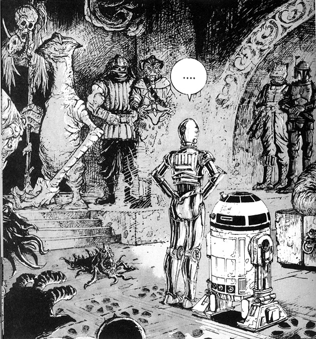 Amanaman, woken with the rest of the court by a pair of humans smooching in the night, peeks out from behind a Gamorrean as Jabba gives orders for the handling of Solo and the Princess.