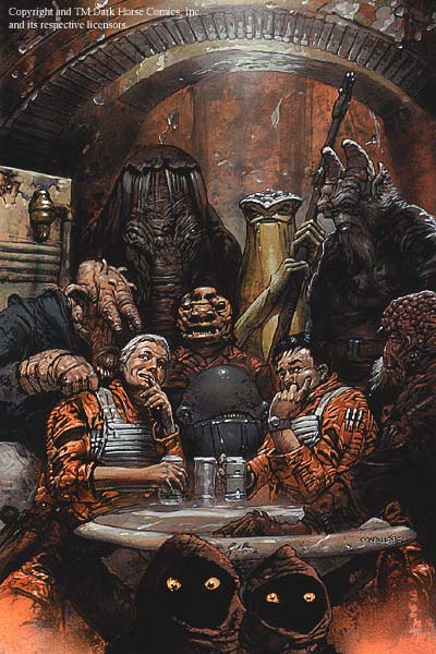 A rather short, smooth-skinned Amani stands over two New Republic pilots on the cover of the Dark Horse comic X-Wing Rogue Squadron - Battleground: Tatooine #1.