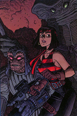 One of Tavira's ferocious pirate henchmen was a large gnarly amanaman. His most prominent physical characteristic is the distinctiveness of his gill slits [like those on the Kenner action figure]. The gills may have been more visible because he is seen standing in an environment which is more moist than that of Tatooine where other amani were pictured; or it may be a genuine racial or personal characteristic. It's also possible that exposure of the gills may be a voluntary or involuntary muscular flaunting action, perhaps signalling aggression or some other important form of arousal.