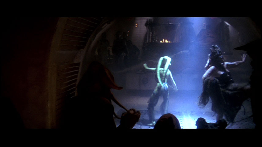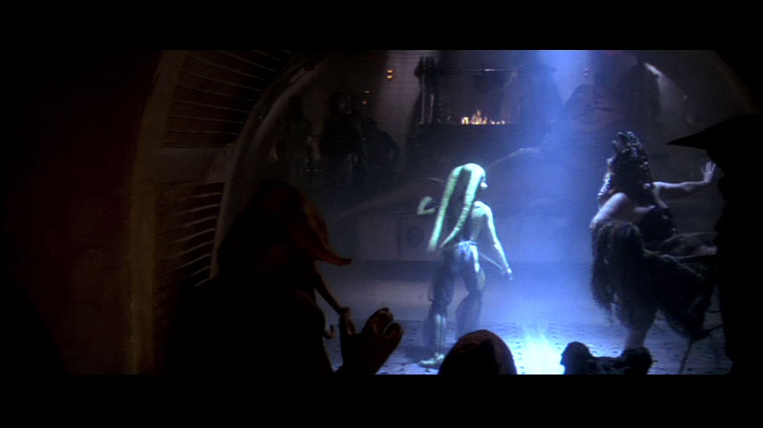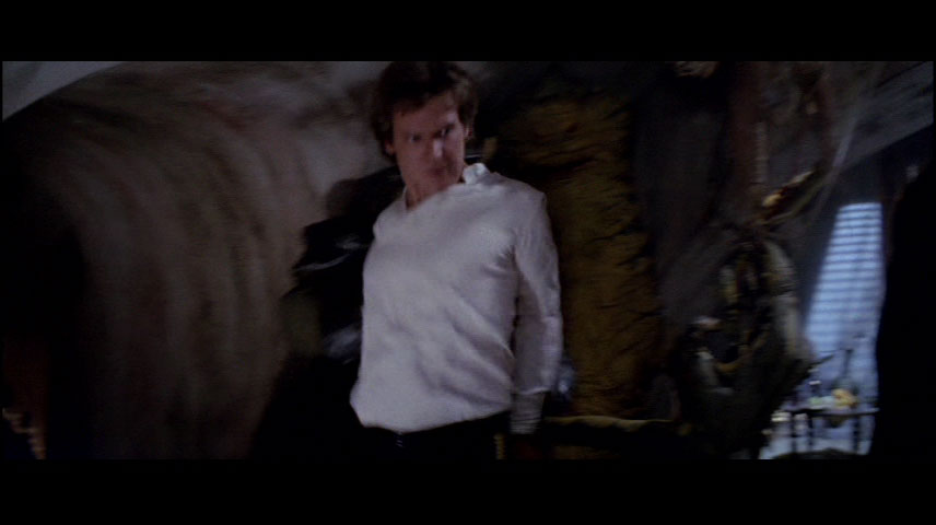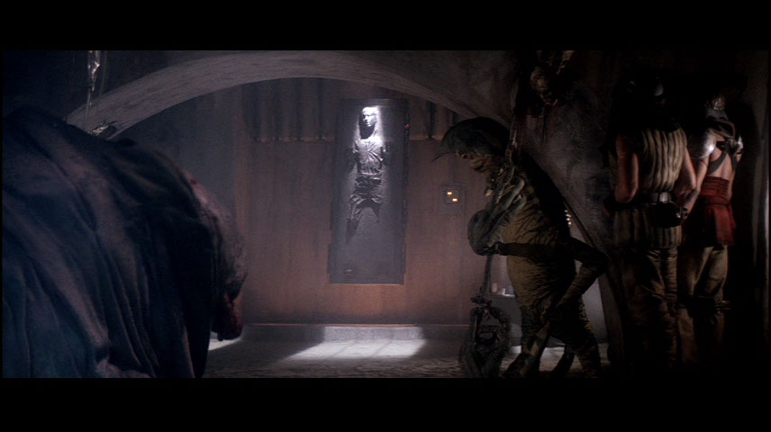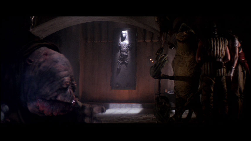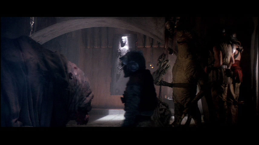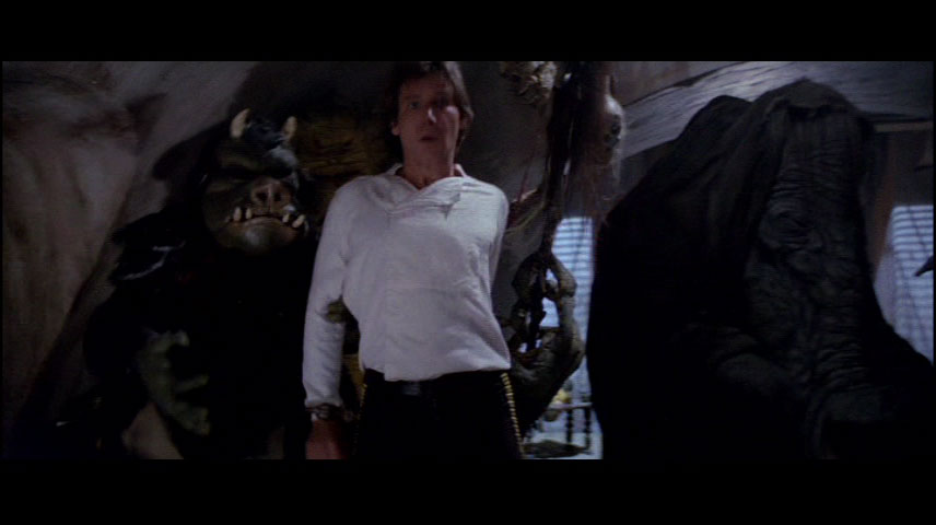 Towering over Solo and a Gamorrean guard to the right of the picture. Narrowscreen views of Solo being shoved past Amanaman.