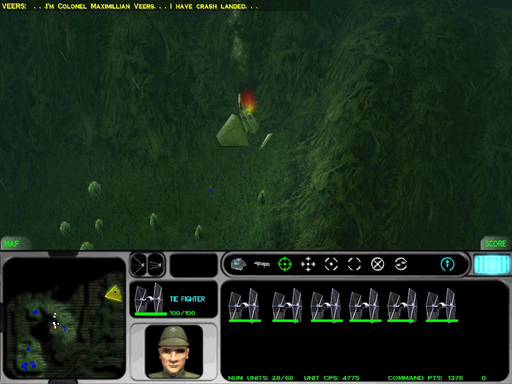 Another, possibly related revelation appears in the game Force Commander. Maximillian Veers, who was a General attached to Lord Vader's taskforce in The Empire Strikes Back, was also at Yavin, ranking as a Colonel. He appears to have been a Death Star survivor; his shuttle crashed on Yavin 4, and one of the game missions revolves around his rescue. He may have departed the Death Star at the same time, by the same means and for the same reason as Tagge and Bast.