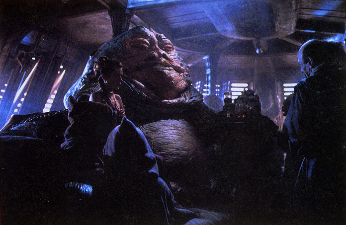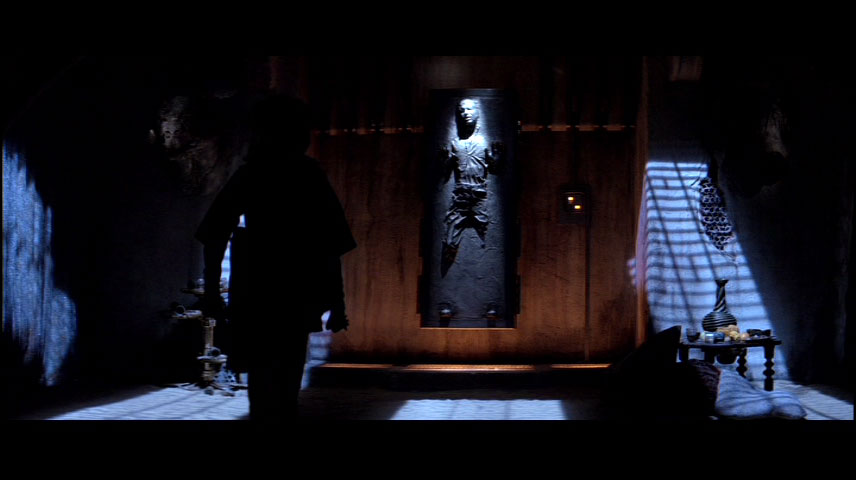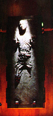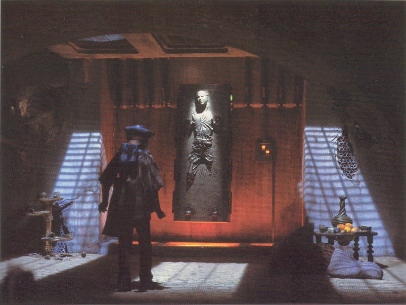 Jabba's favourite decoration was a unique work of art created by Lord Darth Vader. It is an improvised container for the imprisonment of a man placed in hibernation. Use of this particular subject brought great personal satisfaction to Jabba, because Han Solo was a debtor gone bad and brazen, and also a formerly trusted employee who turned traitor against the Hutt's authority. Display of the helpless, hapless Solo had practical benefits as well; it sent a powerful message to other potentially-wayward minions and members of Jabba's court.