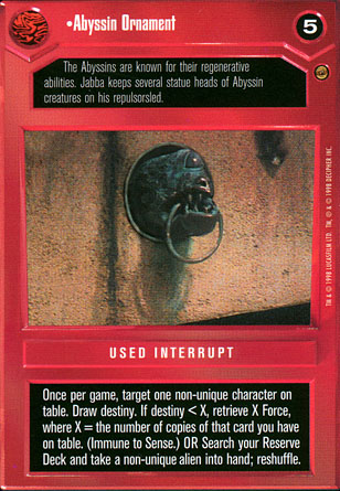 The SWCCG game card claims that these ornamental head sculptures portray Abyssin. However there are several important differences between the features of these artworks and the face of the Abyssin named Myo who was seen in the Mos Eisley cantina. The lips of an abyssin are split and curve inwards, and the face is humanoid and flat; Jabba's sculptures have long snouts instead. Abyssin have blunt molars in their mouths; the heads on Jabba's throne have sharp teeth. If the ornaments are related to the abyssin, they are caricatures. At best, they may be a distantly related animal species from the same world.