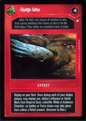 Jabba wears a tattoo on the back side of his right forearm. The tattoo appears to be something deeper than just pigment inserted under his skin; the hide appears to have been deliberately scarred with a pattern. The name of a presently unreleased SWCCG game card, Desilijic Tattoo, indicates that it is a mark of Huttese clan affiliation.