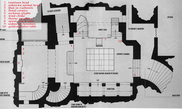Schematics of the sail barge interior. The rancor gargoyle, which is probably the largest one, appears to be on the thick, central truss at the forward end of the observation chamber.
