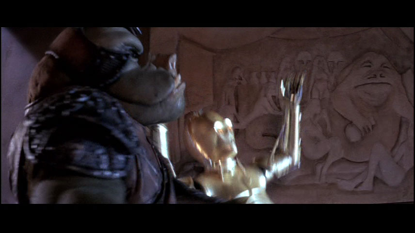 Ishi Tibe gargoyle is visible behind three humans on the far left; the opposite gargoyle is visible but unidentifiable above C-3PO and Bib Fortuna at the far right.