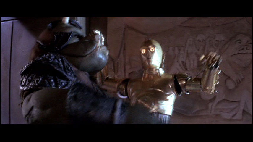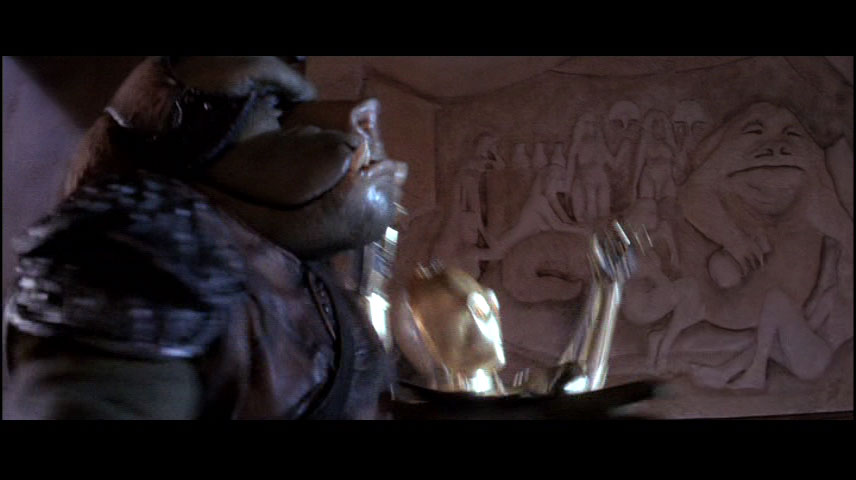 The table, the fruit, C-3PO, the stairs near Jabba's left hand, and a Yuzzum onlooker.