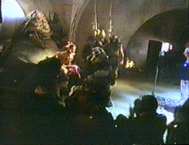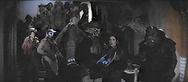 The tauntaun trophy again in closeup, though poorly lit, surrounded by a jawa, a gamorrean and an amanaman. The dried human head is actually an ornament on the amanaman's trophy staff; it is not part of Jabba's collection.