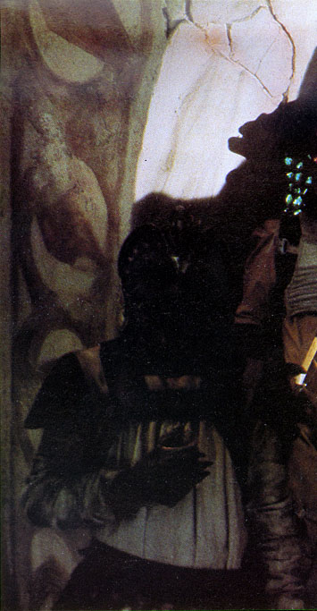 Hooka fittings at the head side of Jabba's throne. First image: behind Calrissian; second image: above and behind the man and yuzzum; third image: to Jabba's left, above his head; fourth image: right side, far behind the Gamorrean (whose back is turned to Jabba); fifth image: far wall, behind Bib Fortuna (ignore extratextual foreground film crew). [Behind the Magic; Star Wars to Jedi: the Making of a Saga]