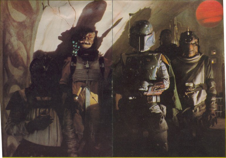 The significance of the heads of these seemingly mundane creatures is not clear. The female tauntaun, with its horns, could be a vicious beast if it is not domesticated. Alternatively, it might have significance in connection with Solo, since the Corellian had ridden a tauntaun on Hoth. Perhaps Solo has ridden a Jerba as well? Or perhaps the arrangement of animal heads implies that Solo himself, a drug smuggler, is regarded as a former pack animal in the Hutt's service.
