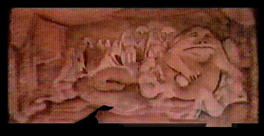 This picture decorated one of the walls of the luxury sail barge of Jabba the Hutt. It was about one-and-a-half metres long and perhaps four-fifths of a metre high. It appears to be a relief cut in tan/ochre sandstone, which according to SWCCG lore, was from the adoptive Hutt homeworld of Nal Hutta. The piece, entitled Ne Ganna Dateel Jabba is said to have been designed by a Huttese artist named Dreyba.