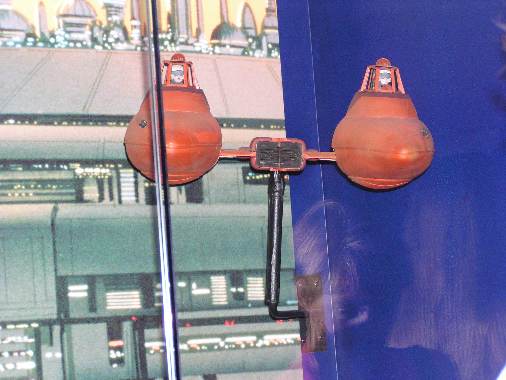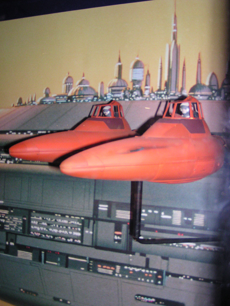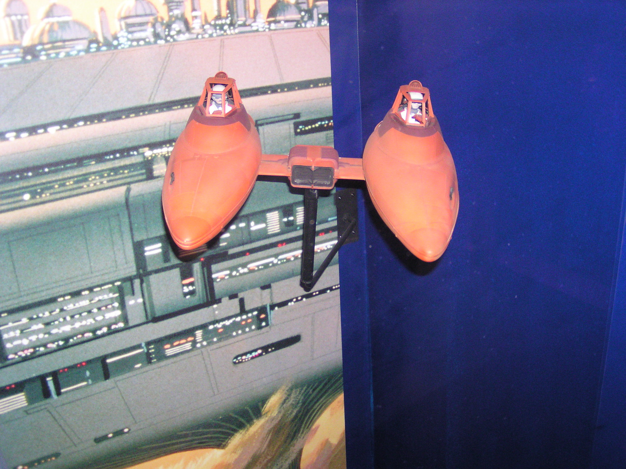 Frontal view of a twin-pod cloud car of a type flown by security forces on Bespin. Two laser cannons muzzles are the dark spots set in the outer sides of both pods. The boxy section in the centre of the bridging hull appears to be an air intake: this is necessary for a jet engine that provides forward thrust. (Contrary to a common misconception, the repulsorlift antigravity effect only provides an upward lift, against the prevailing gravitational field.) [Jan 2003]