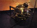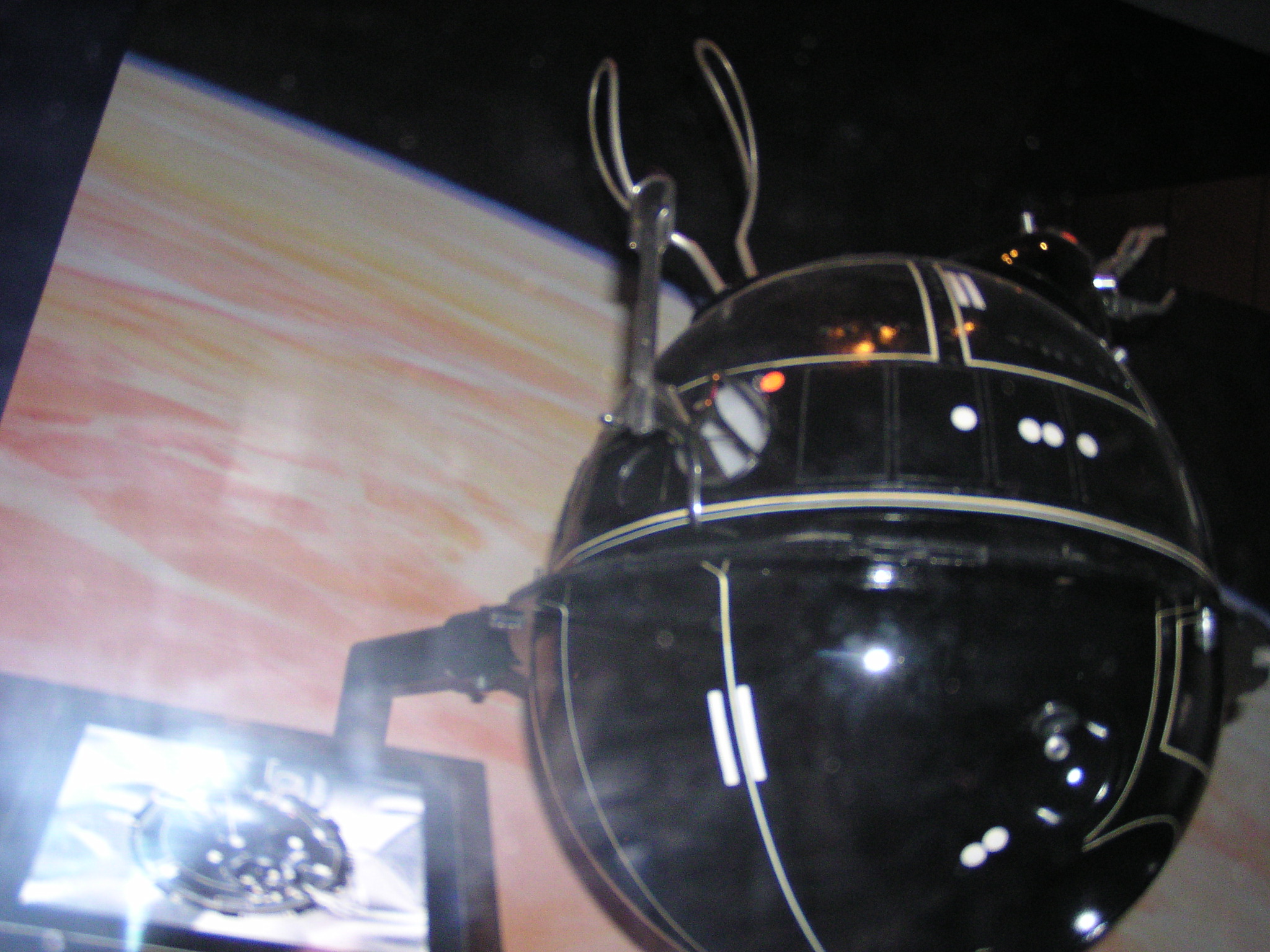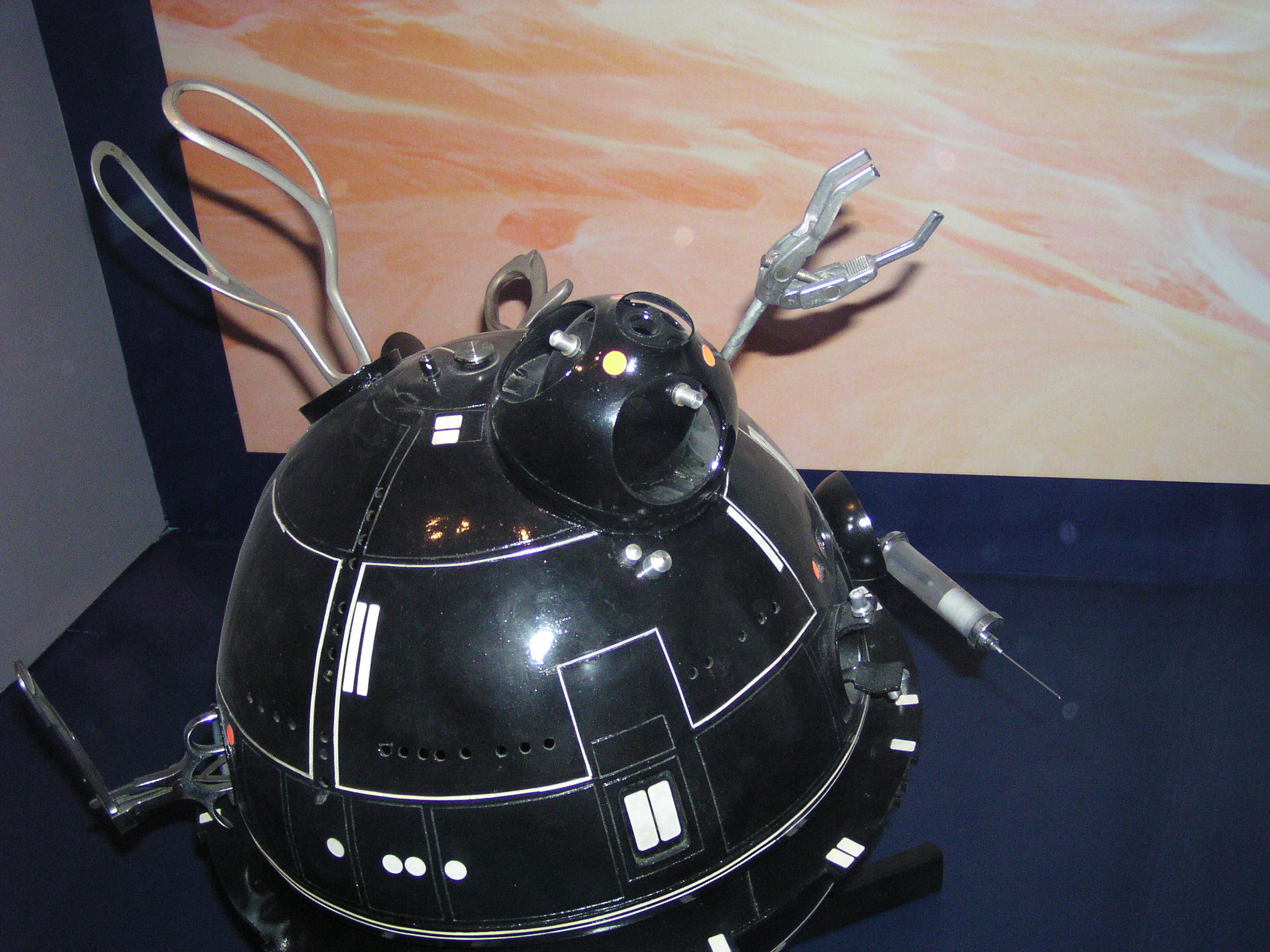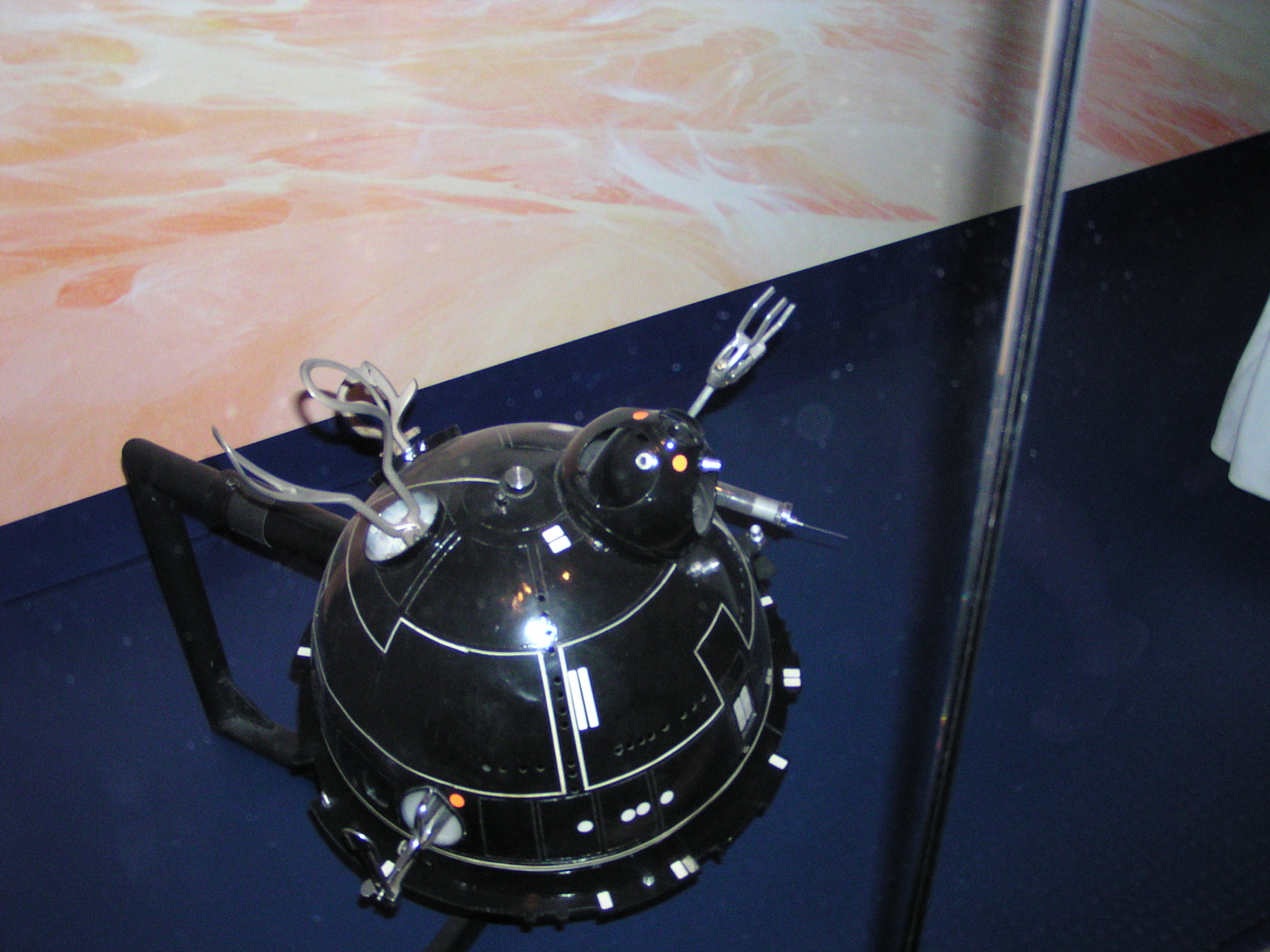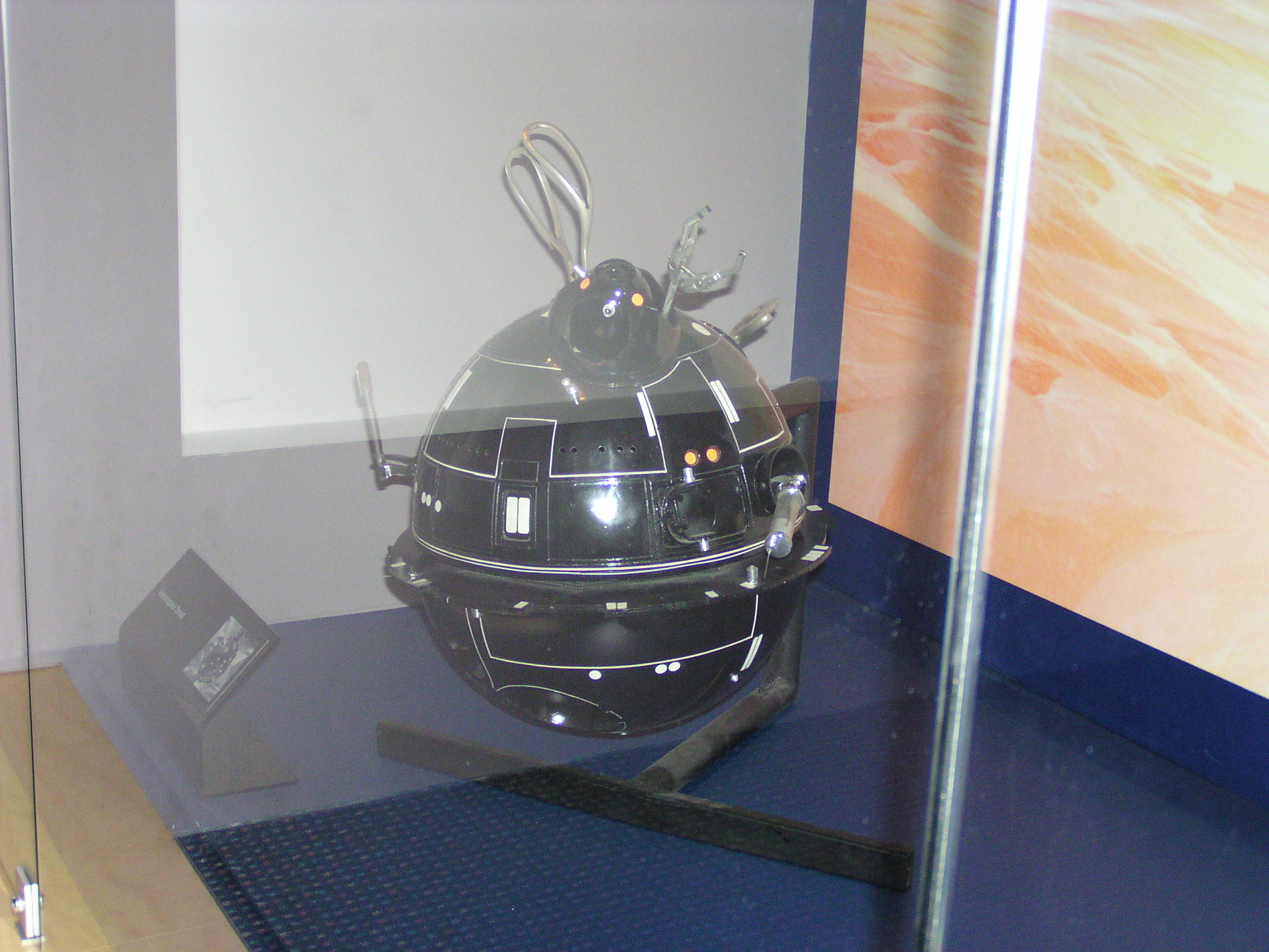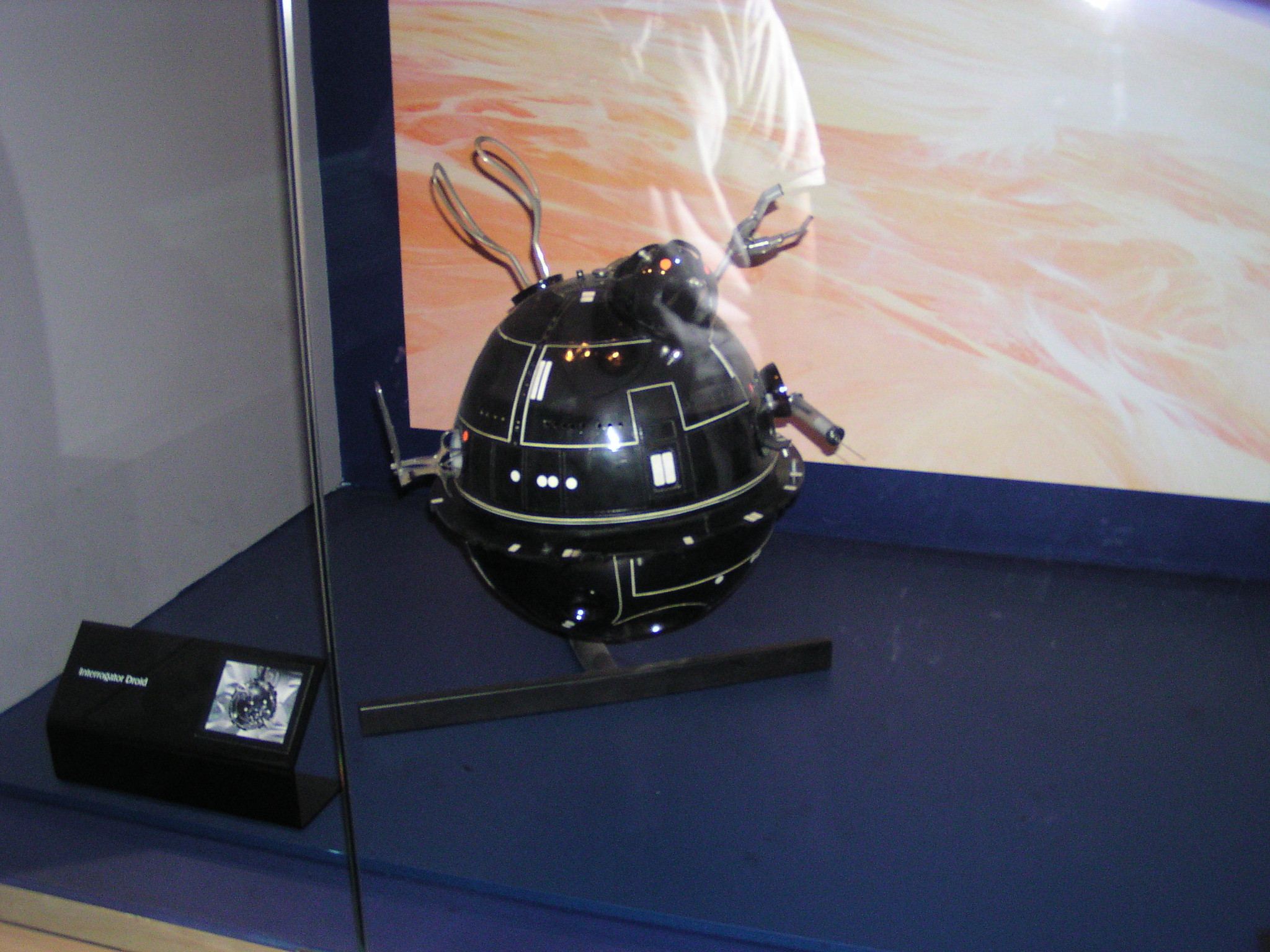 Front underside of the interrogator droid. The two dish-like pits contain some obviously important devices. Are they sensors (including photoreceptors) or are they designed to emit beams of something into the subject? The differences between the fittings of the two dishes suggests that they serve different functions, whatever they may be. |