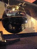 A medium-range view of the droid's left side. The droid's two hemispheres are essentially the same as the dome of an R2 astromech droid, but with different attachments and painted detailing on the panels. [Martyn Griffiths noticed this equivalence.] The most visible attachments on this side of the droid are a syringe appendage, a clamp/claw and a mysterious bulbous structure on top. |