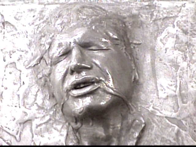 Han Solo's face preserved in carbonite. Note the solidified trickled around his mouth and chin. Was the carbonite condensed to a liquid before solidification? Did Solo cough carbonite during the freezing process, or is this simply his natural drool? His teeth appear white. Are the exposed from the carbonite surface? If so then are any of the other interior surfaces of his mouth exposed? In Shadows of the Empire [comic] Boba Fett remarked that Solo could survive in vacuum. If he is correct then all the soft tissues must have been covered (or infused) with carbonite.