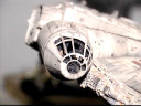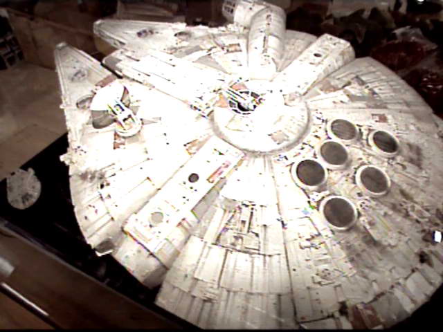 Large model of the Millennium Falcon built for A New Hope, with small model constructed for long-distance shots at lower left. This image might allow the models' scales to be determined. |