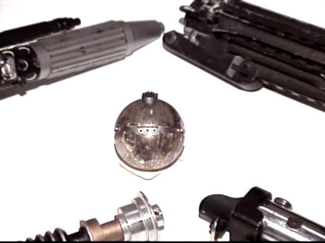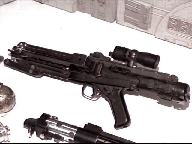 Various prop weapons. Centre: thermal detonator. Bottom left: Kenobi or Luke (ROTJ) lightsabre. Bottom right: Anakin or Vader lightsabre. Top left: blaster. Top right: stormtrooper blaster rifle. |