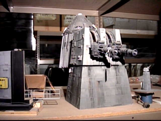 Death Star flak turret models: large scale (left) and small scale (right). The smaller-scale model portrays the entire flak tower and was used for longer shots, while the large model was used for closeups of the turret turning and firing. Speculation: was this smaller version used for the capture of the Falcon scene, from distance? The conical object in the background is a part of the Death Star II reactor base. |