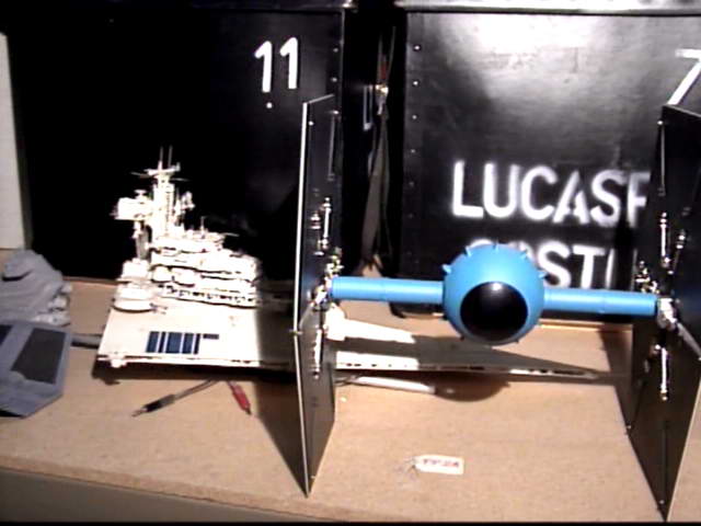 Prototype models by Colin Cantwell: TIE Fighter at right, with early star destroyer prototype at left/rear. These models were used to impress potential investors while funding for Star Wars was being raised. The star destroyer is shown with stern on its left side, potentially enabling scaling. |
