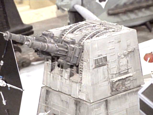 Closeup: Death Star flak turret model, large-scale. This view shows the intricate detail usually built into 'hero' models, i.e. those built for closeup scenes. The wing of the prototype TIE Fighter is visible at left, as is the rear of the Death Star Mouse Droid at upper left. At rear is the nose of a German fighter aircraft from Indiana Jones and the Last Crusade. Speculative interpretation: the image may also show the inner “guts” of a star destroyer stern on the right. That feature looks like the indentation. |