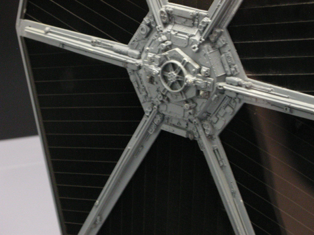 The rear areas of the portside radiator wing of a TIE interceptor. The gadgetry around the wing hub, presumably the main components of the radiator heat exchangers, are larger than those on the wings of a TIE fighter. [22 Dec] |