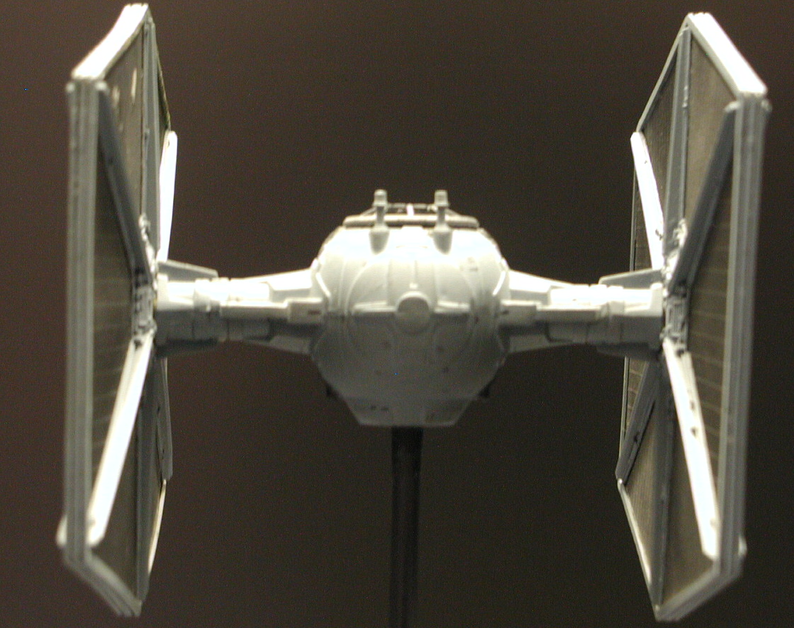 A view of the TIE interceptor from above. Very fine details of the dorsal surfaces of the cockpit bulb are visible. The upper circular cap is rotated out of its usual position; normally the window stripes are closest to the stern. |