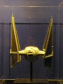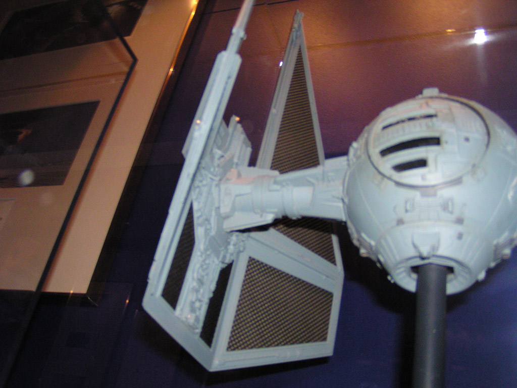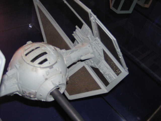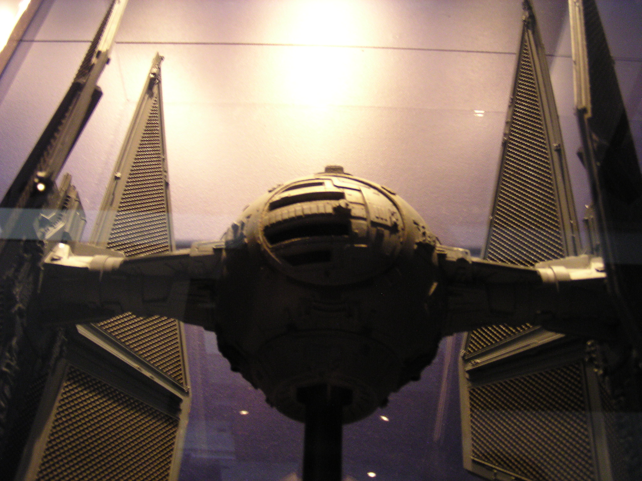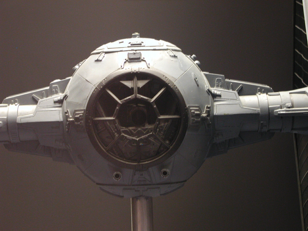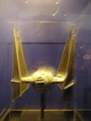 A model of the most common kind TIE fighter, viewed from the front. Some thin raised ridges onthe radiator surfaces are visible in the glossy reflections. Off the right side of this photograph is the right shoulder of a mannequin in the uniform of a TIE pilot. |