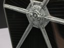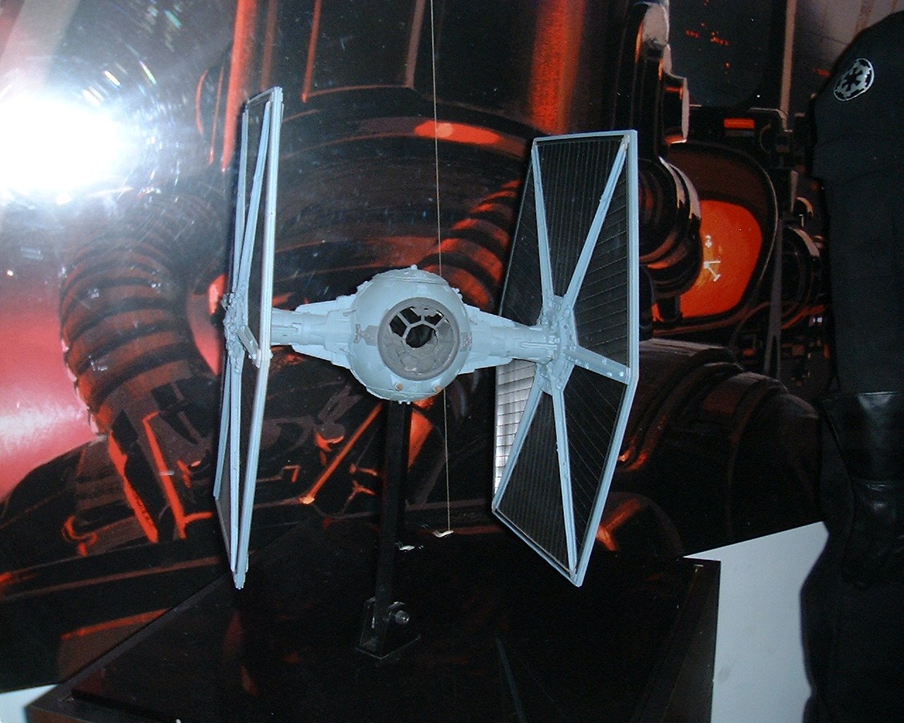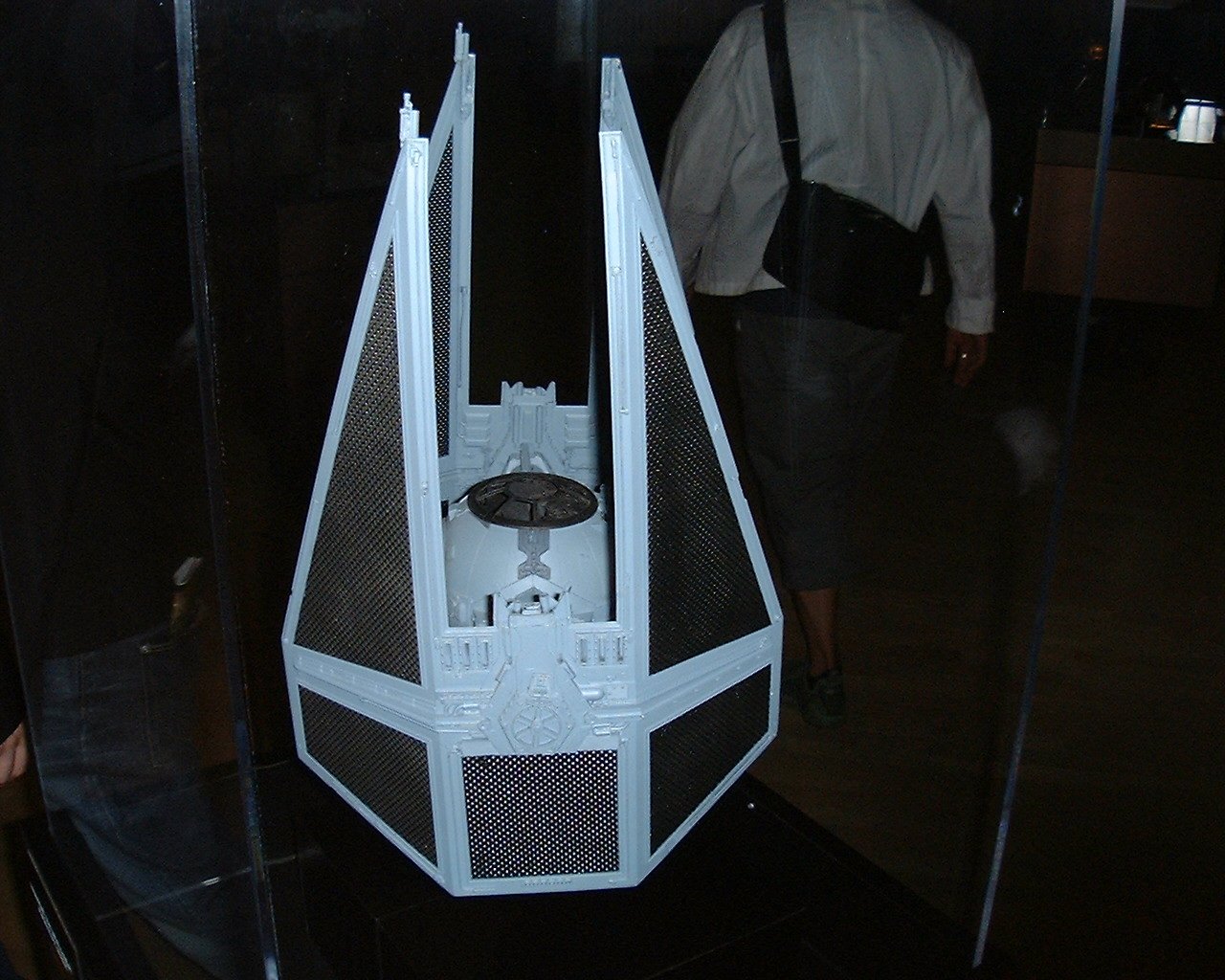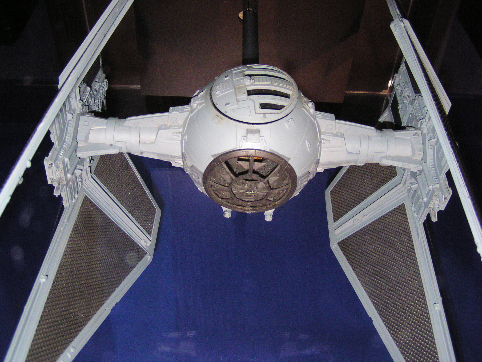 A model of the most common kind TIE fighter, viewed from the front. Some thin raised ridges onthe radiator surfaces are visible in the glossy reflections. Off the right side of this photograph is the right shoulder of a mannequin in the uniform of a TIE pilot. |