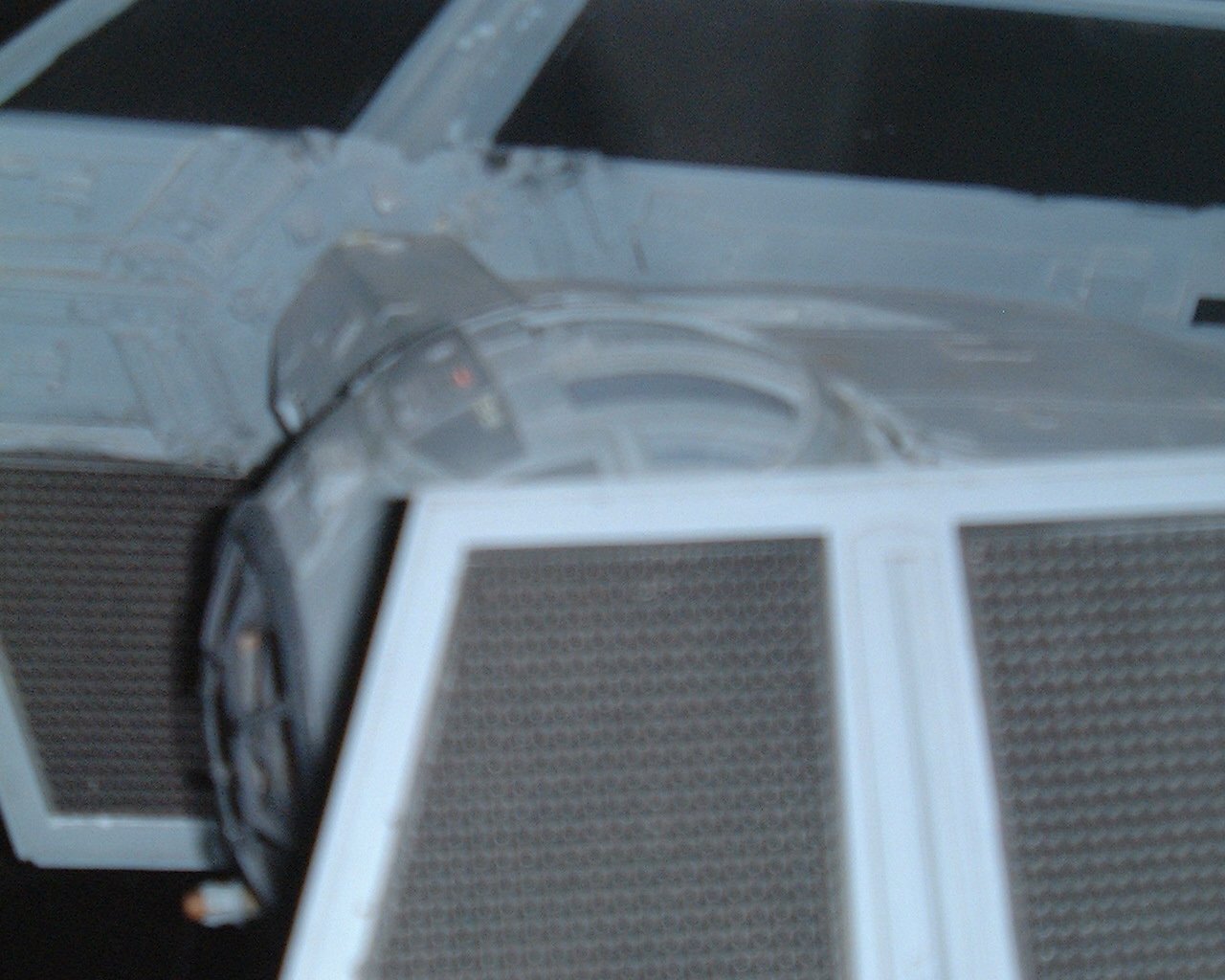 Somewhat blurry image of the details at the front of the cockpit. The pylons supporting the radiator wings are significantly thicker than those of a standard TIE fighter, implying greater reactor power and consequently greater needs for disposal of waste heat. Some of the piping between the reactor systems and the radiators appear exposed in angular slits on the front faces of the pylons. Perhaps these holes are meant for additional cooling, or perhaps they facilitate access to maintenance-intensive components of this high-performance starship. |