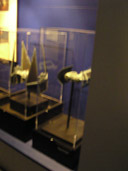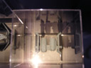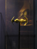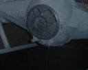 TIE interceptor model in its display case, as seen from off the portside wing. The lower portside wingtip canon is missing; the upper portside canon is intact. The pattern of pastel-coloured spots is merely the carpet reflected in the display case; it could potentially provide useful 3D reference. [21 Dec] |
