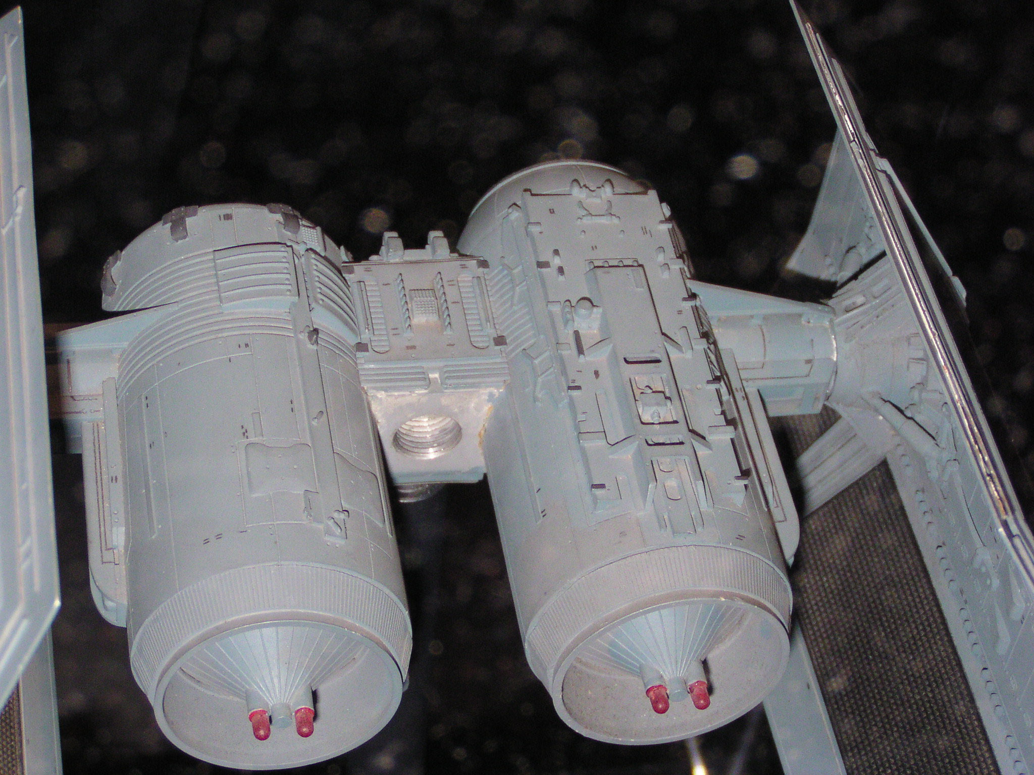 Rear dorsal surfaces of the TIE interceptor. Note that the lid-like secant section hasn't been installed properly: the four windows should be aligned longitudinally, at the back end. [21 Dec] |