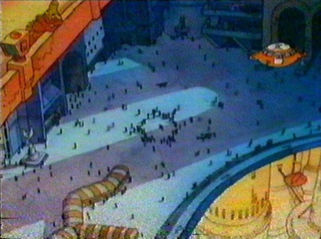 Multi-level interior of the huge city on Panna. Airspeeders move through a hole between levels. A small crowd gathers around what may be a public entertainer or busker. Also visible are a fountain or statue, and a series of tents, perhaps for a market.