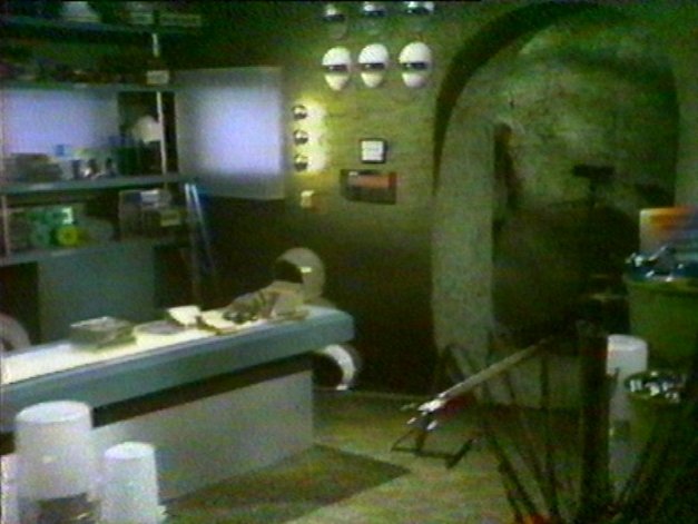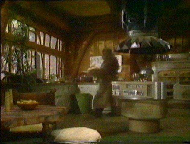 The ground floor area farthest from the entrance is the kitchen. There are benches on the circumferential wall and the radial wall that ends the main living area. On the radial wall there are windowed cupboards which may contain foodstuffs. A flatscreen display stands on the outer bench, where Mallatobuck receives video cooking lessons. A circular stove/oven stands between the kitchen and the lounge area, with a large air-hood hanging over it. Both are over a metre in diameter.