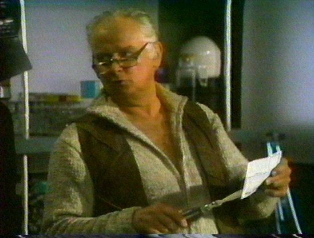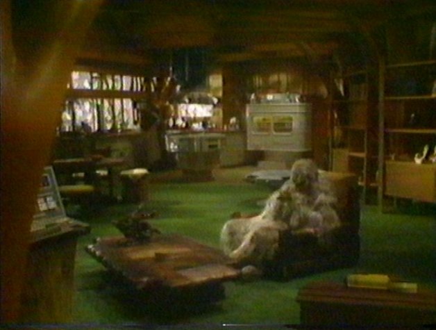 Lounge room interior, facing towards the kitchen. Chewbacca's father Itchy is fixing an orange model of what seems to be an X-wing fighter. He is annoyed when his relatives rouse him.