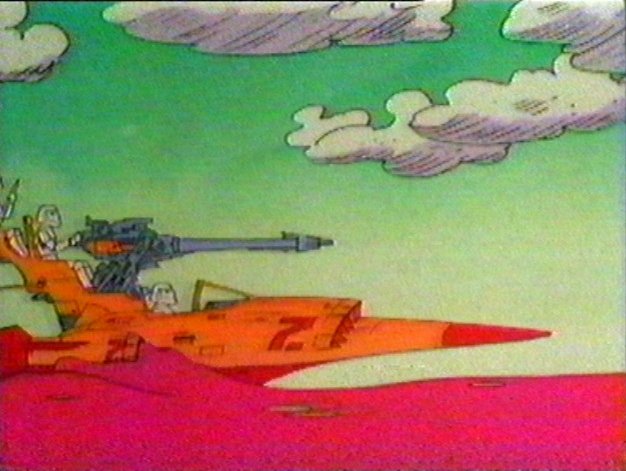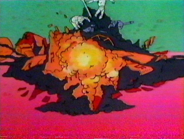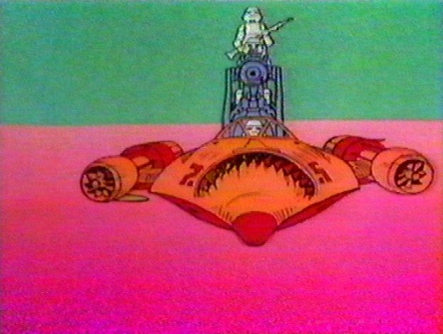 Front view of the landspeeder as it explodes after a critical blaster hit by Chewbacca. Note that the emblems on the left and right sides of the hull are reversed. In other words it is more like a directional arrow than a Latin, Greek or Cyrillic alphabet letter. However the Galactic Basic writing in ROTJ was reversible, [Text & Graphics].