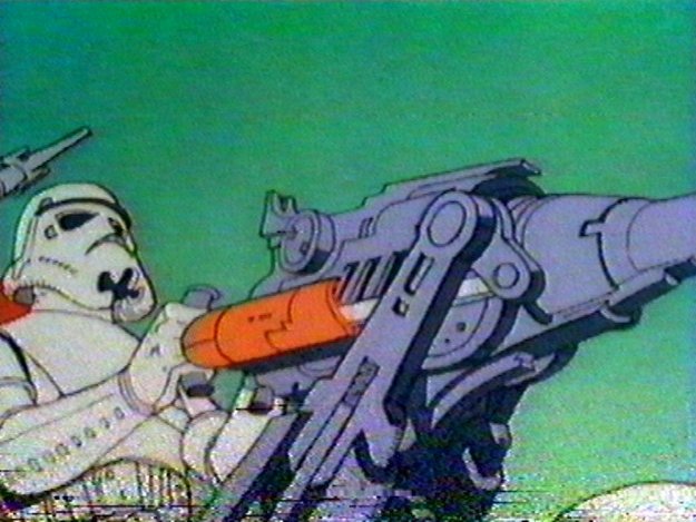 Chewbacca and Fett were pursued from the base of the Panna city by a trio of Imperial stormtroopers on a military landspeeder, with a siren blaring. The speeder is armed with an imposing laser cannon, fired by a gunner in a middle seat. The pilot sits in a semi-open cockpit at the front; a passenger stormtrooper sits in a high seat behind the gunner.