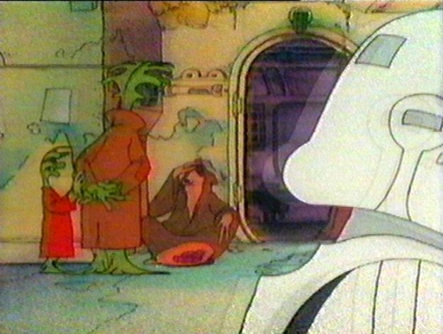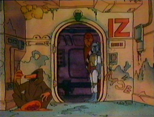 Fett leaves Chewbacca hiding in an alcove while he seeks the serum for the sleeping virus. This is a diverse and literally cosmopolitan city. Aliens such as the frond-headed parent and child haggling for fruit are as distinctive as any in the movies. The pale skin and red eyes of the Rodian beggar may be signs of peculiar ill health, or a racial alternative to the Rodian people seen in the movies.