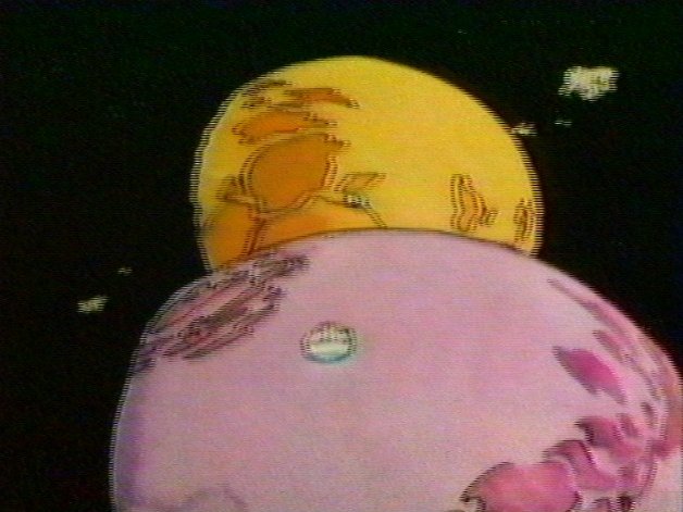 The inhabited moon is largely covered in a red/pink gelatinous mud, and at least one huge domed city stands on a rocky ridge or mesa above the mud.