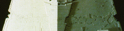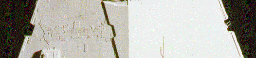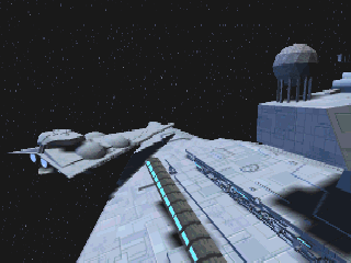 Two frames from behind, showing a turbolaser bolt released from a weapon mounted amidst the machinery at the forward portside corner of the main docking bay. Compare the two images to spot the motion of the bolt.