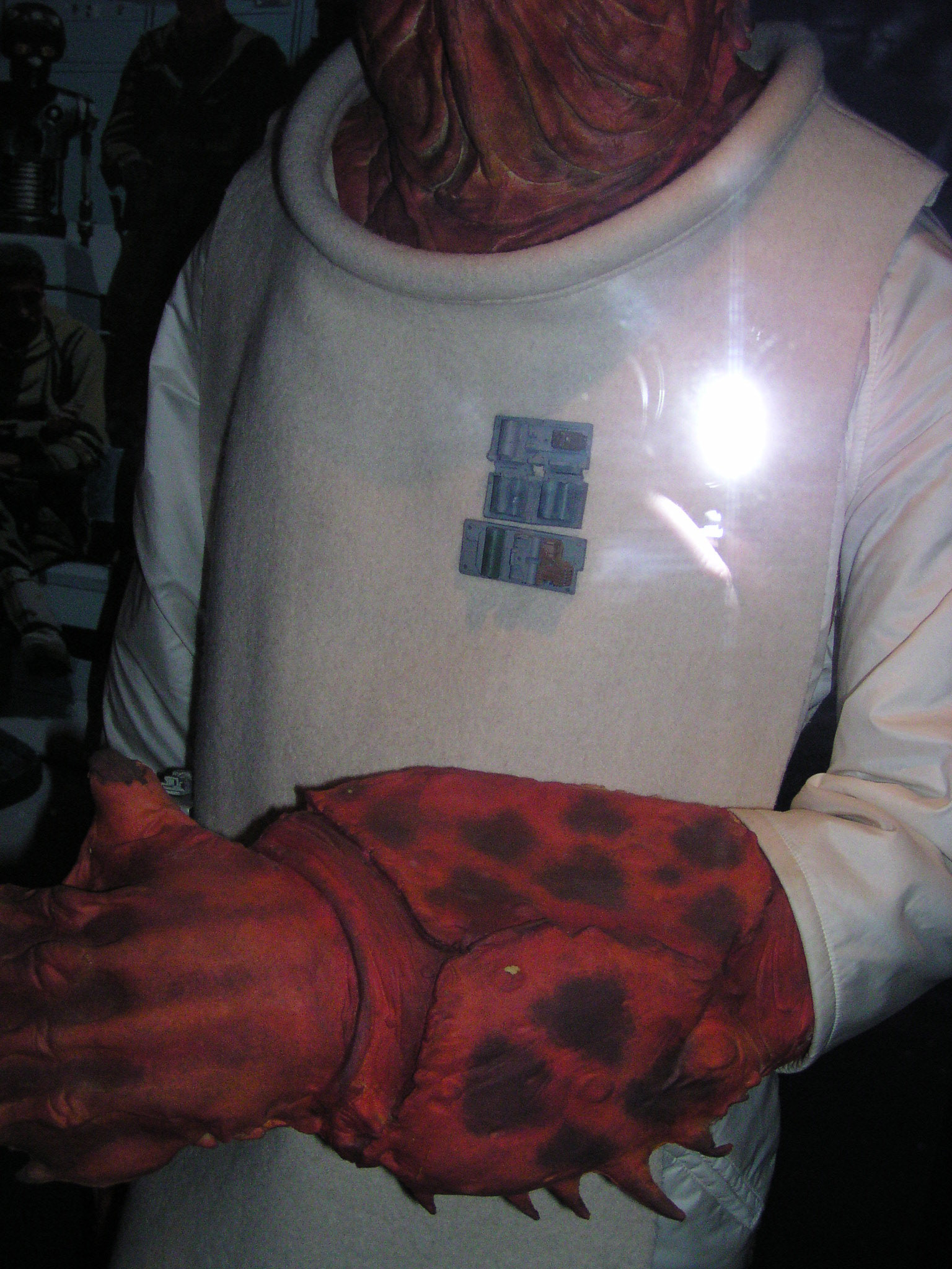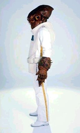 Clear side view of Admiral Ackbar in uniform: beige jerkin, white shirt and white trousers with a yellow outside seam, which is similar to the trouser stripes of Princess Leia and Calrissian.