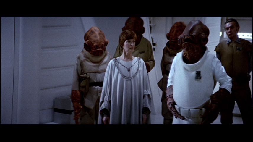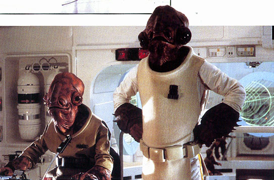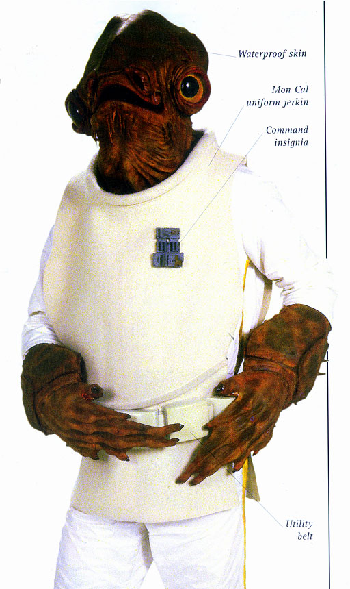 Aside from the Ewoks, the Mon Calamari are the most extensively represented non-human species in the STAR WARS. (Jawas don't count because we don't see any parts of their bodies.) The total number of distinct Calamarians seen in Return of the Jedi is at least eight distinct individuals: Admiral Ackbar; three of four bridge crewmen; one trooper; and three dignitaries (of whom at least two were in civilian dress). Since the Mon Calamari are so numerous onscreen, they are a potentially fruitful topic of investigation. Unlike species which have thusfar been represented by single members, it is possible to compare different individuals and thus to distinguish the general traits of the species from personal characteristics.