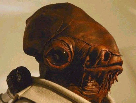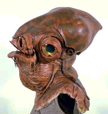 Image of a Mon Calamari soldier. This is not, as was mistakenly reported in some published sources, Admiral Ackbar. Ackbar's eyes are a nearly uniform yellow-gold; this individual has more reddish streaks in his eyes.