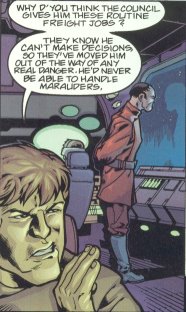 Other examples of Old Republic naval and military personnel appear in the spin-off literature. Numerous Senate Guards accompany Chancellor Valorum in Jedi Council: Acts of War. In Eternity's End the non-commissioned crew of an unfortunate naval vessel wear uniforms the same as in TPM, except that the cloth is green instead of blue. The ship's captain wears a red uniform (like Imperial Intelligence Director Ysanne Isard decades later), but his rank insignia are unseen in every available view.