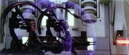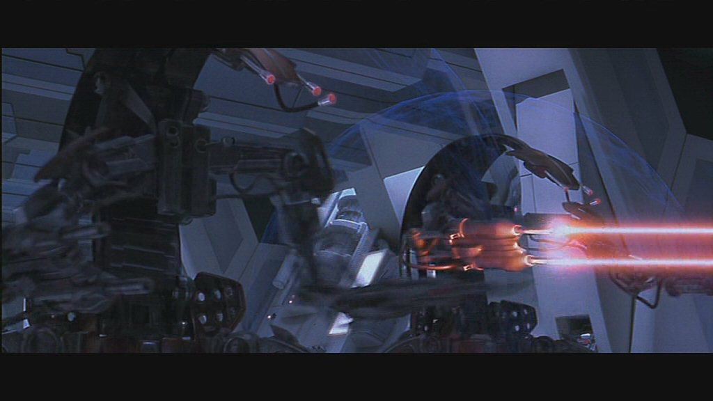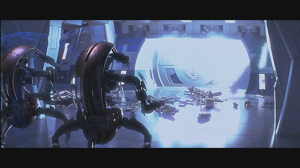 The first noteworthy and novel example of shielding in The Phantom Menace is the person-scale shielding projected by the droidekas of the Trade Federation. Droids using their shields usually remain stationary (with the one exception being the last droideka fleeing Anakin Skywalker's defence of the Theed hangar). It is unknown whether the shields innately make movement difficult, can only be activated by a motionless droid, or whether there is a deliberate restriction on droideka behaviour. Perhaps the absorption of heavy fire by the shields produces a kick that can knock over a droideka that doesn't stand with braced legs. (Whether their legs protrude from the shields, and whether the shields penetrate the ground may also have some bearing on this question.)