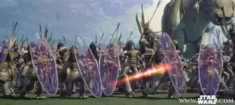 Gungan infantry take shelter under large deflector and ray shields carried by huge domesticated animals.